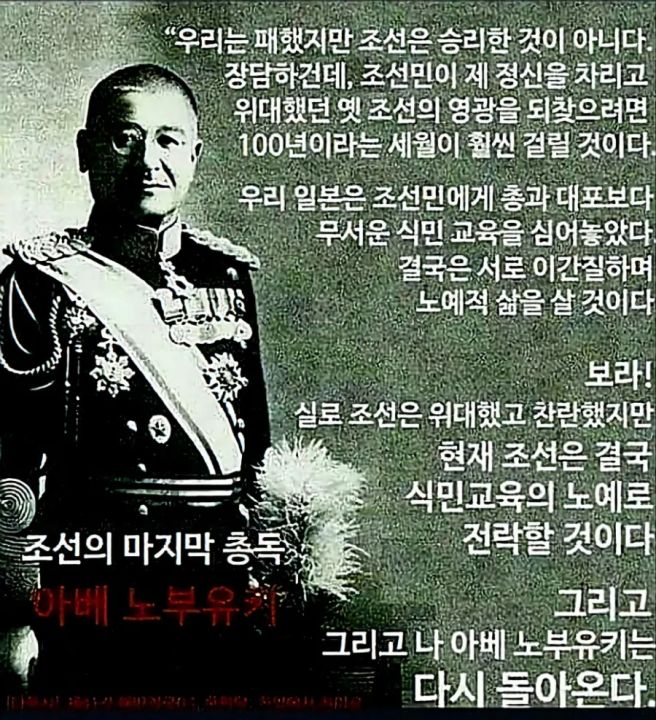 조선의 마지막 총독 아베 노부유키의 예언의 일부를 인용하자면 대일본제국은 패전하였지만 조선은 승리한 것이 아니라며 장담하건대, 조선인들이 다시 제정신을 차리고 찬란하고 위대했던 옛 조선의 영광을 되찾으려면 100여년이라는 세월이 훨씬 걸릴 것이라고 예언을 남겼다.